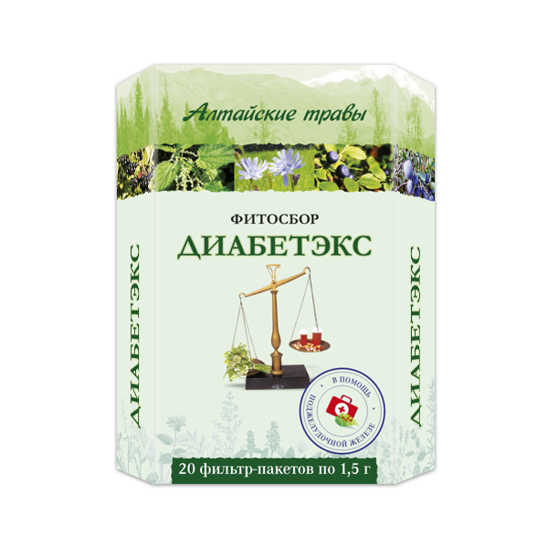 Фитосбор «Диабетэкс» серии «Алтайские травы» – растительный комплекс, оказывающий положительное влияние на организм. Травы, входящие в состав фитосбора, принимают в качестве противодиабетического, вяжущего, мочегонного и диетического средства, нормализуют уровень сахара в крови. Оказывает помощь поджелудочной железе.